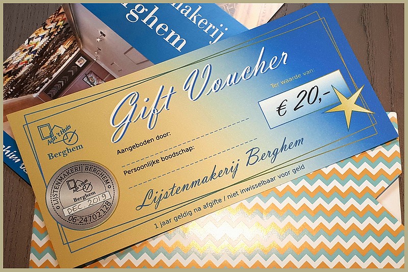 Een voucher kopen? Laat dit even weten en wij maken uw voucher voor u op maat, waarna u deze kunt ophalen in onze lijstenmakerij.